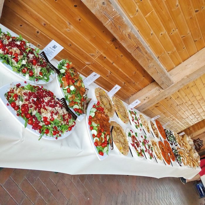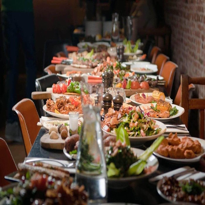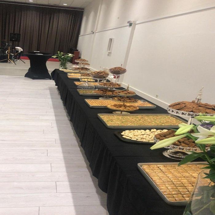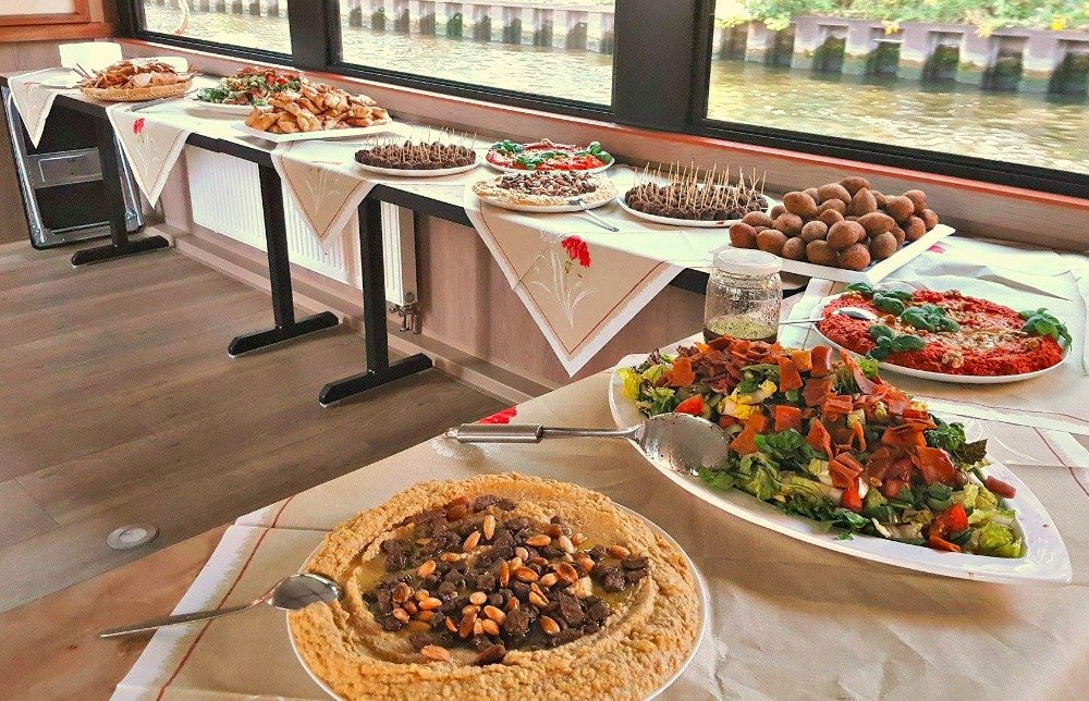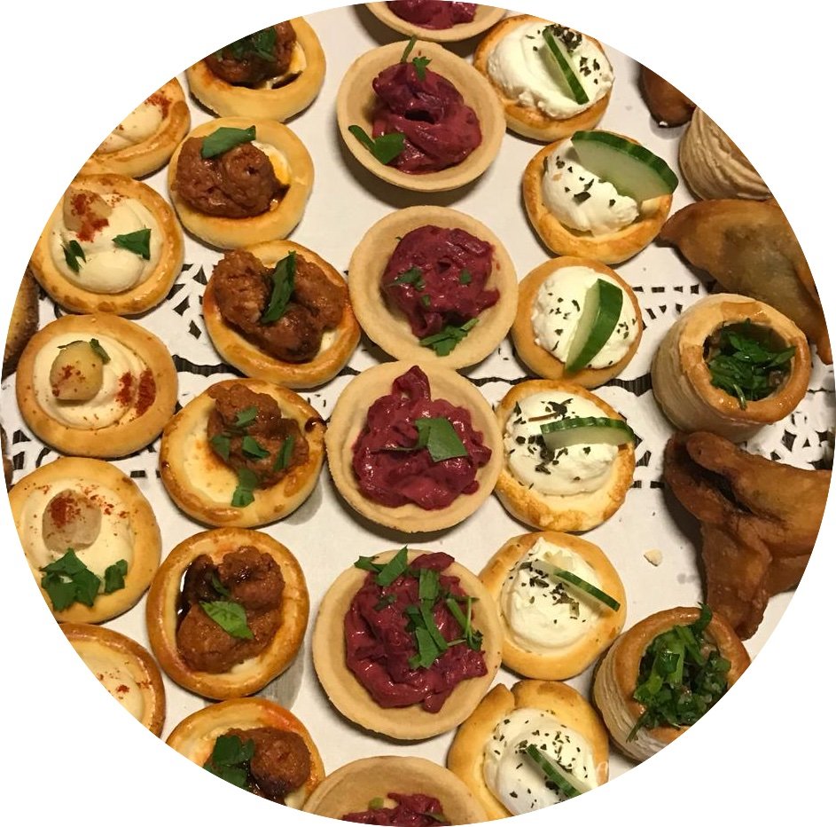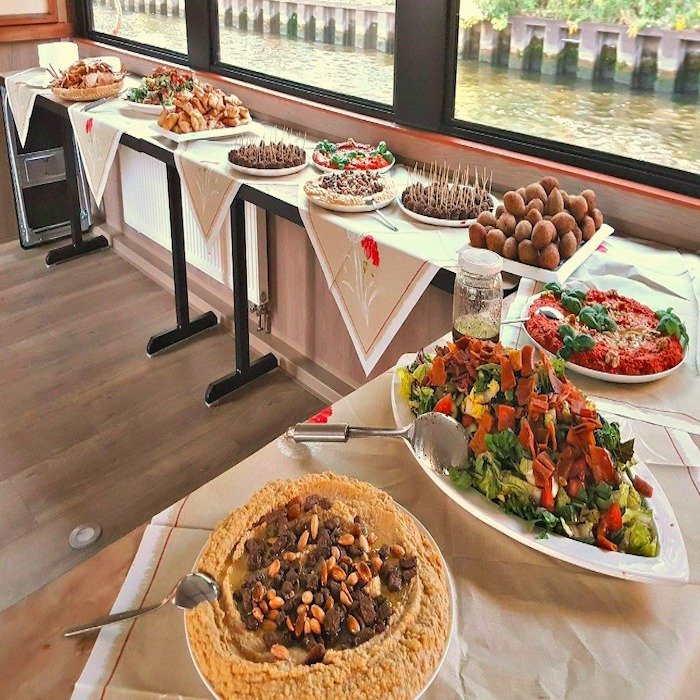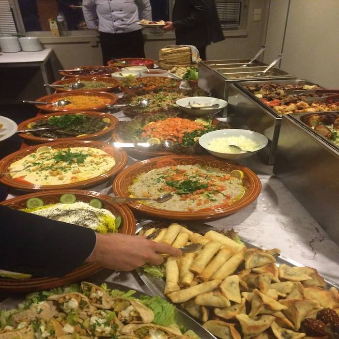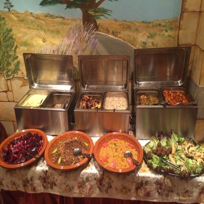 Buffet include: seasonal fruits, Lebanese bread, Sauce piquante, Sauce garlic.